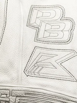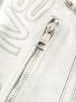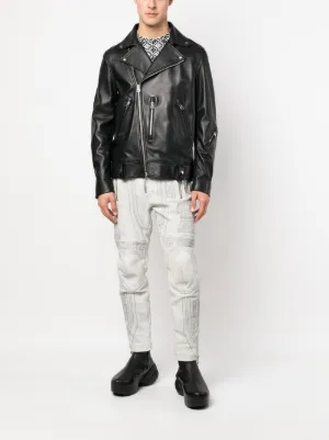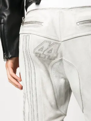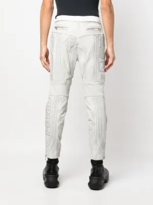 Balmain embroidered-design tapered leather trousers white calf leather seam detailing logo lettering embroidered design button fastening belted waist zip fly fastening front zip fastening pockets two rear zip-fastening pockets knee-pad detailing side zip fastening tapered leg Imported Composition Outer: Calf Leather 100%, Polyester 68%, Elastodiene 32% Lining: Viscose 52%, Cotton 48% Washing instructions Specialist Cleaning Wearing The model is 6 ft 1 in wearing size 48 Product IDs FARFETCH ID: 19228729 Brand style ID: YH0QH017LB83