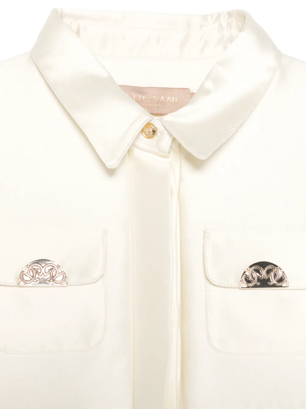 New Season ELIE SAAB JUNIOR pocket dress Made in Italy Highlights cream front pockets short sleeves button fastening classic collar gathered waist Composition Outer: Polyester 85%, Silk 15% Lining: Viscose 100% Washing instructions Dry Clean Only Product IDs FARFETCH ID: 33959385 Brand style ID: EFAB119TS0807