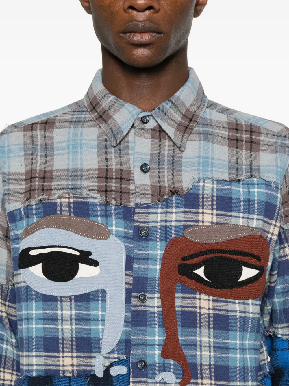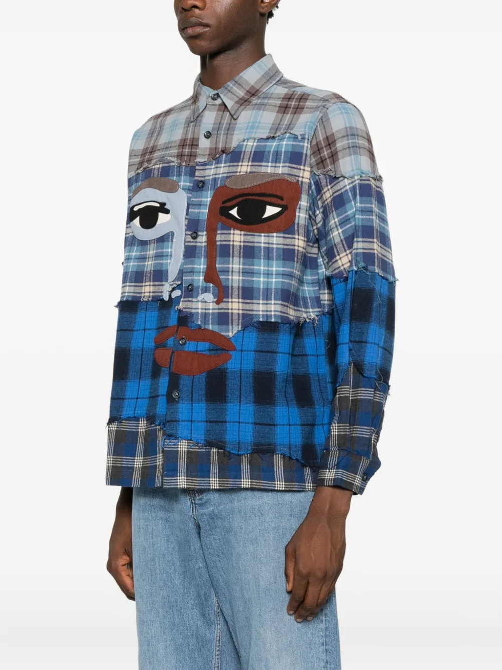 KidSuper face-appliqué patchwork shirt Imported Highlights blue patchwork design face appliqué check pattern front button fastening long sleeves Composition Cotton 100% Washing instructions Read Manufacturer Guidelines Wearing The model is 6 ft 2 in wearing size M Product IDs FARFETCH ID: 32285607 Brand style ID: AW25LTP05