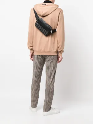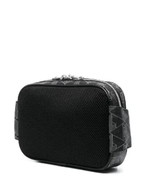 black/white artificial leather grained texture debossed logo to the front monogram print adjustable shoulder strap top zip fastening main compartment internal logo patch internal slip pocket full lining