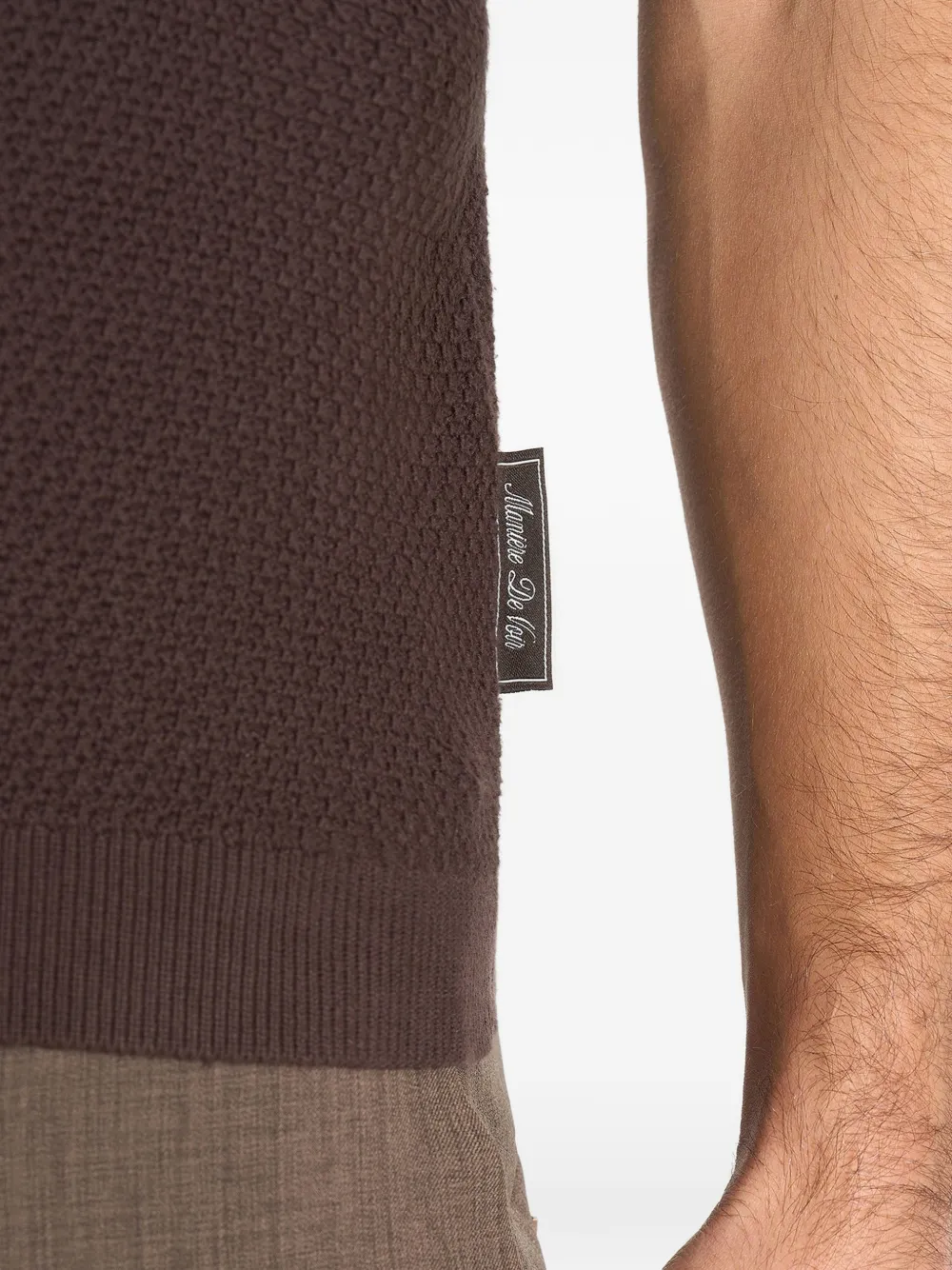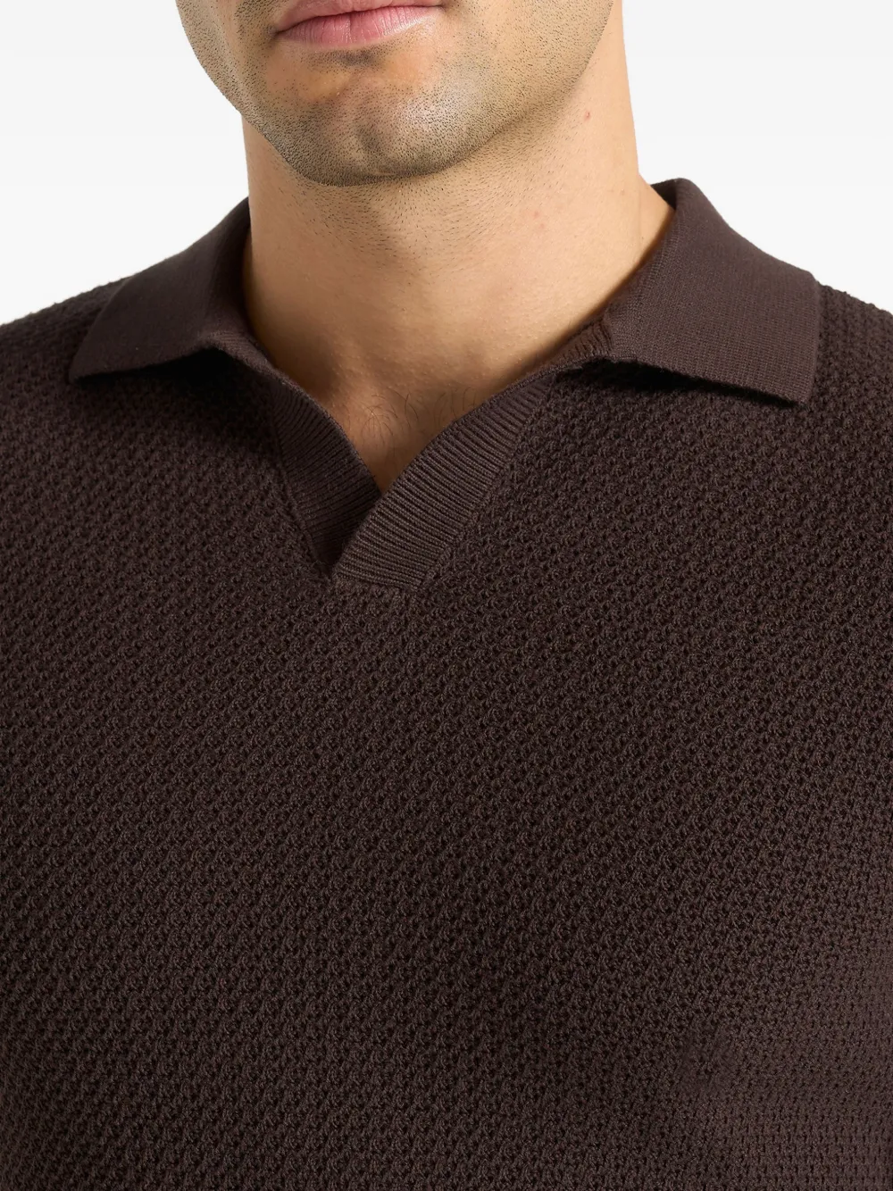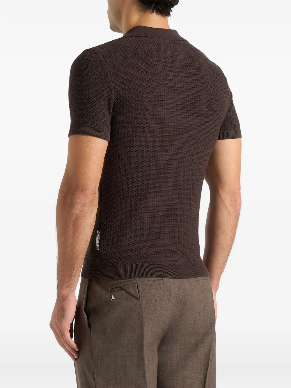 Manière De Voir Rowen textured knitted polo shirt Imported Highlights brown knitted texture revere collar short sleeves ribbed hem and cuffs Composition Cotton 85%, Elastane 15% Washing instructions Read Manufacturer Guidelines Product IDs FARFETCH ID: 33323040 Brand style ID: MAN3553