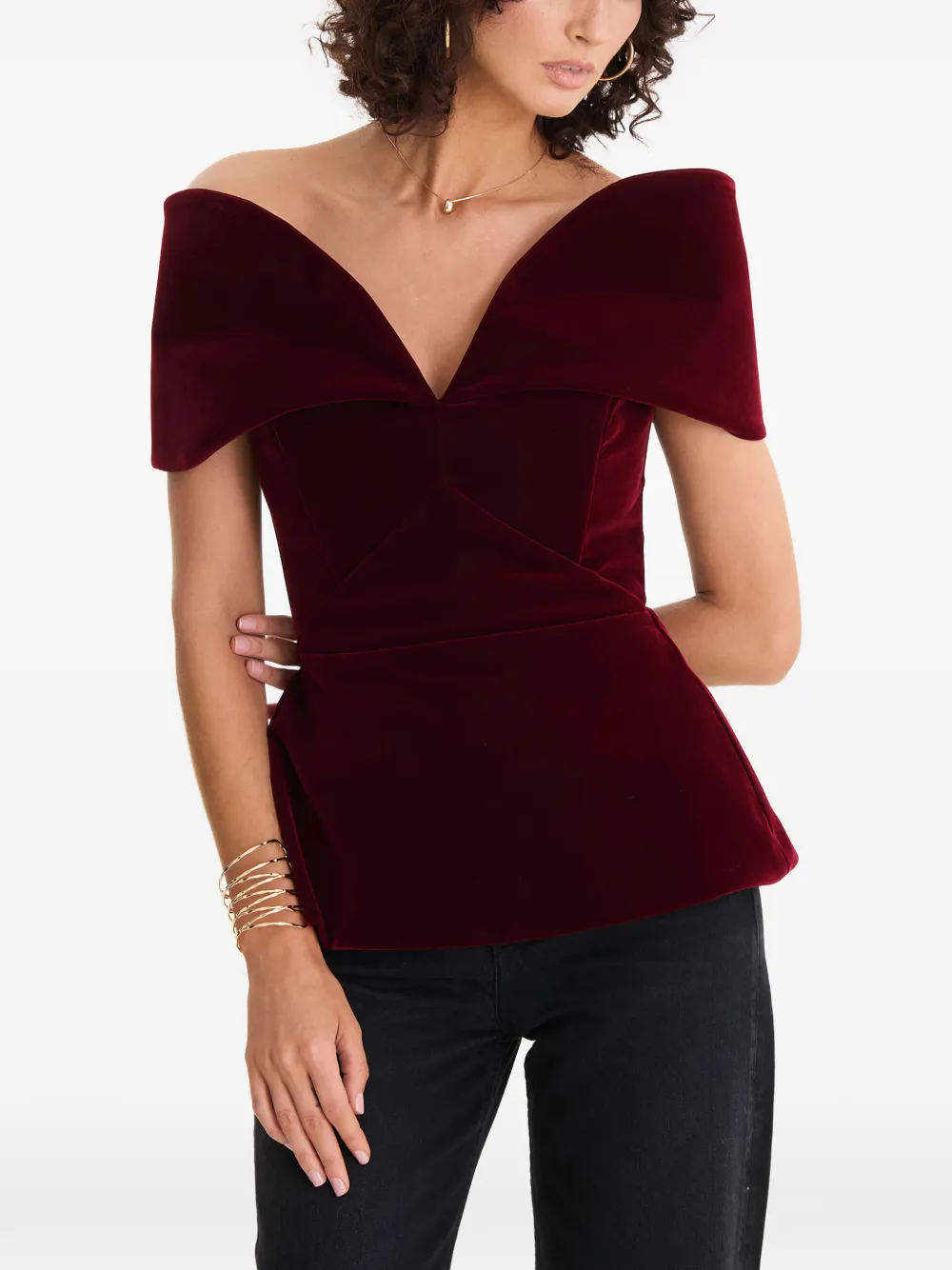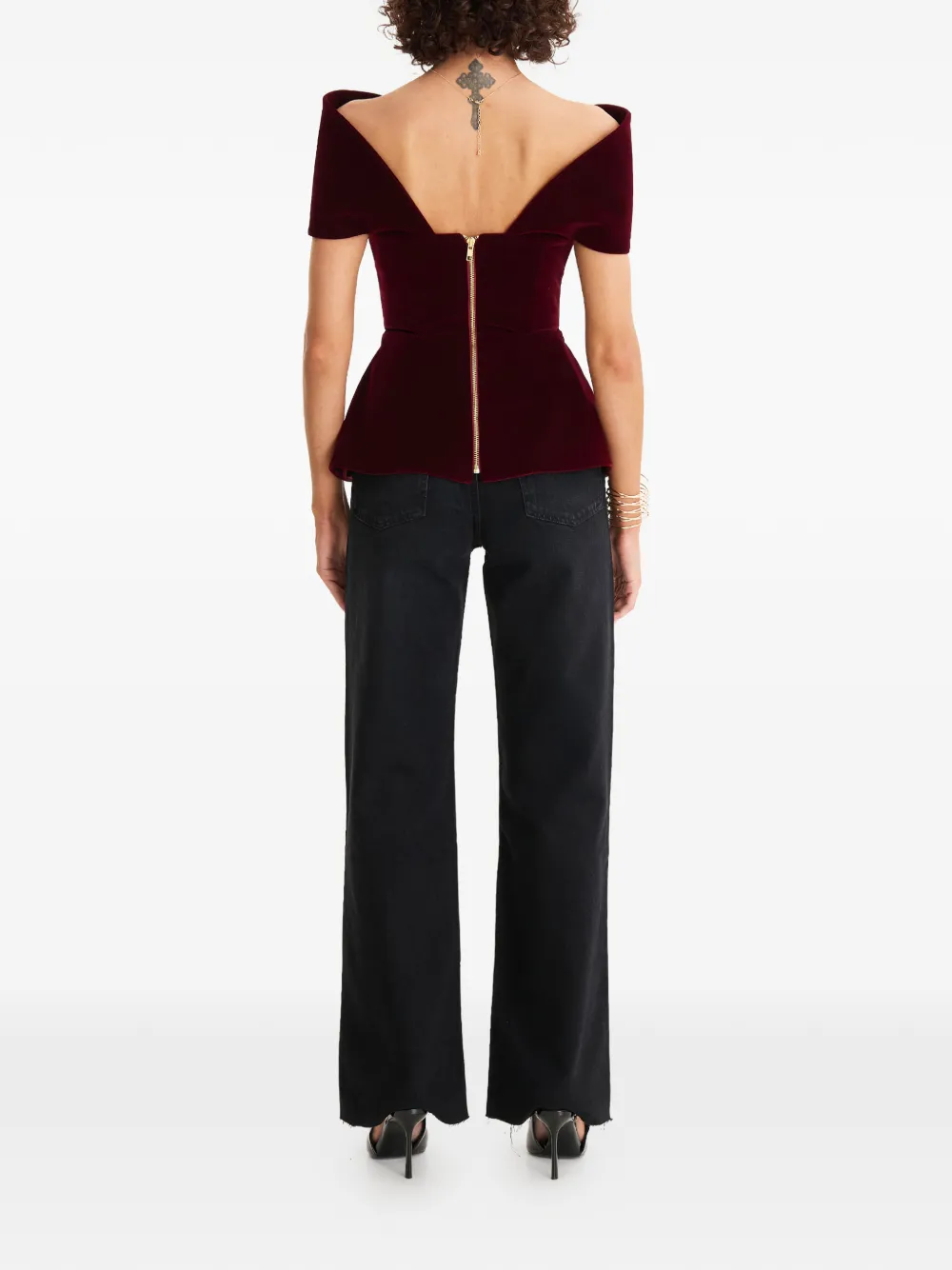 New Season MOOS STUDIO velvet-textured top Imported Highlights burgundy off-shoulder style short sleeve V-neck peplum hem zip fastening Composition Cotton 100% Washing instructions Read Manufacturer Guidelines Product IDs FARFETCH ID: 33107562 Brand style ID: MOOS127