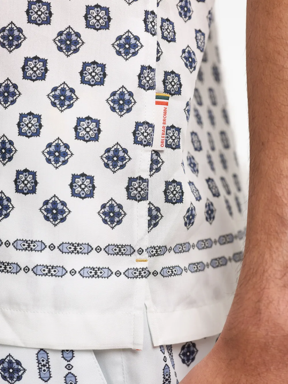 New Season Orlebar Brown Maitan geometric-print shirt Imported Highlights white geometric print short sleeves V-neck capri collar Composition Lyocell 100% Washing instructions Machine Wash Product IDs FARFETCH ID: 32489014 Brand style ID: 281515
