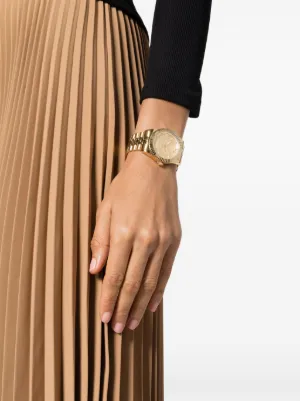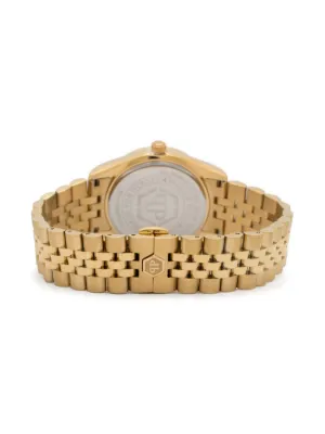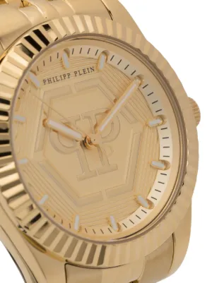 Philipp Plein's Date Superlative 38mm stands out as a refined timepiece amongst the brand's extravagant range. Its round stainless steel case is anchored by a sleek link bracelet and adorned with a light-reflecting fluted bezel. The baton dial is adorned with the label's hexagon logo, rendering it unmistakable.