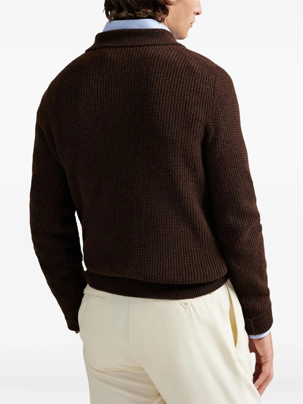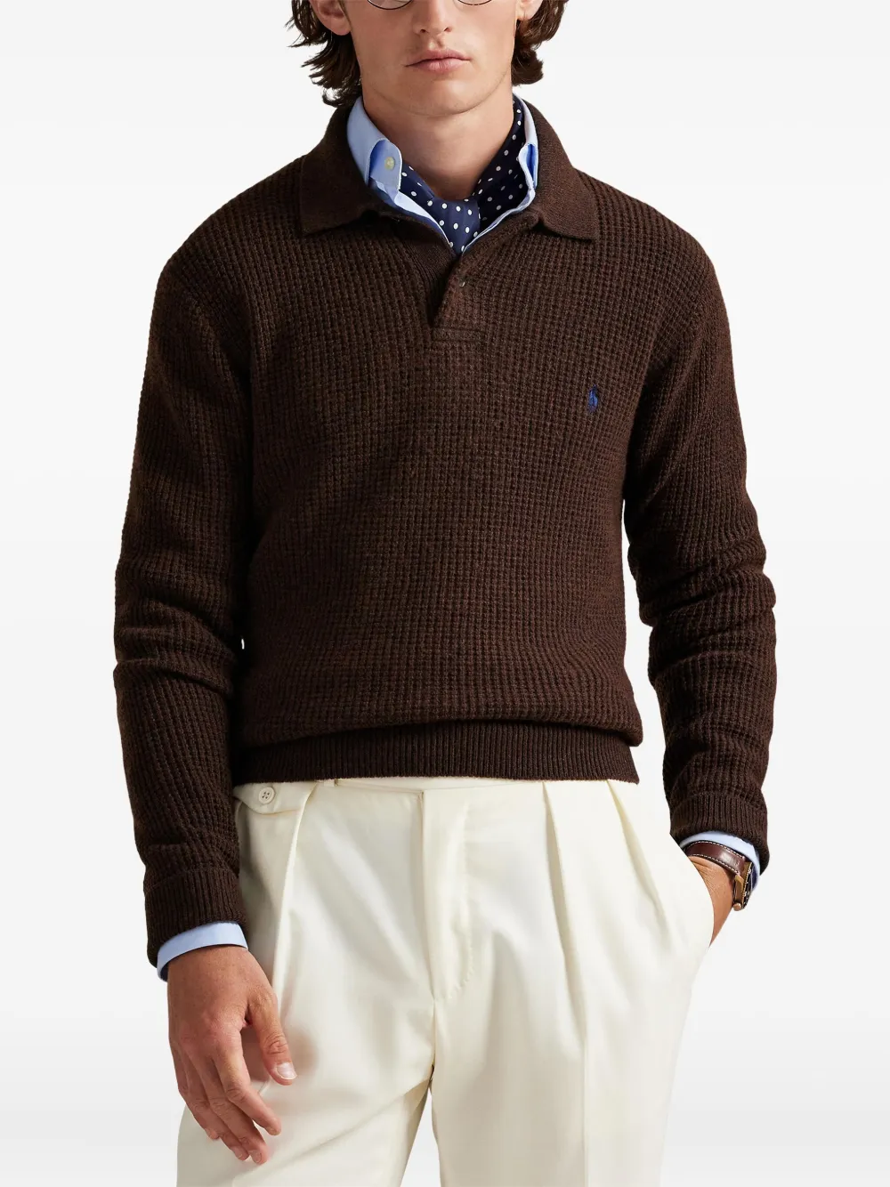 Polo Ralph Lauren waffle-knit polo-collar sweater Imported Highlights brown waffle-knit polo collar two-button placket long sleeves rib-knit cuffs Composition Wool 55%, Cotton 45% Washing instructions Read Manufacturer Guidelines Product IDs FARFETCH ID: 32610819 Brand style ID: 710979110