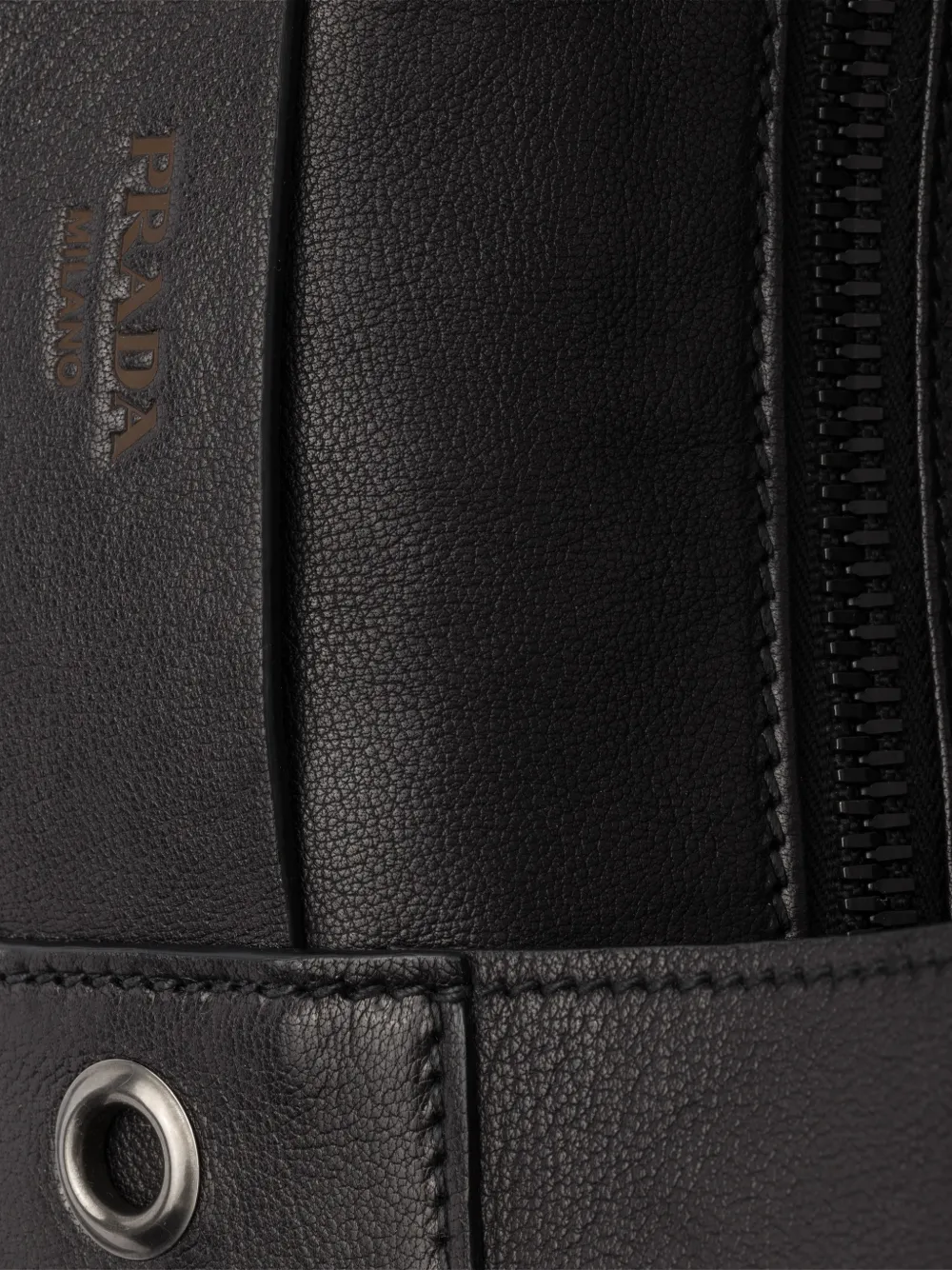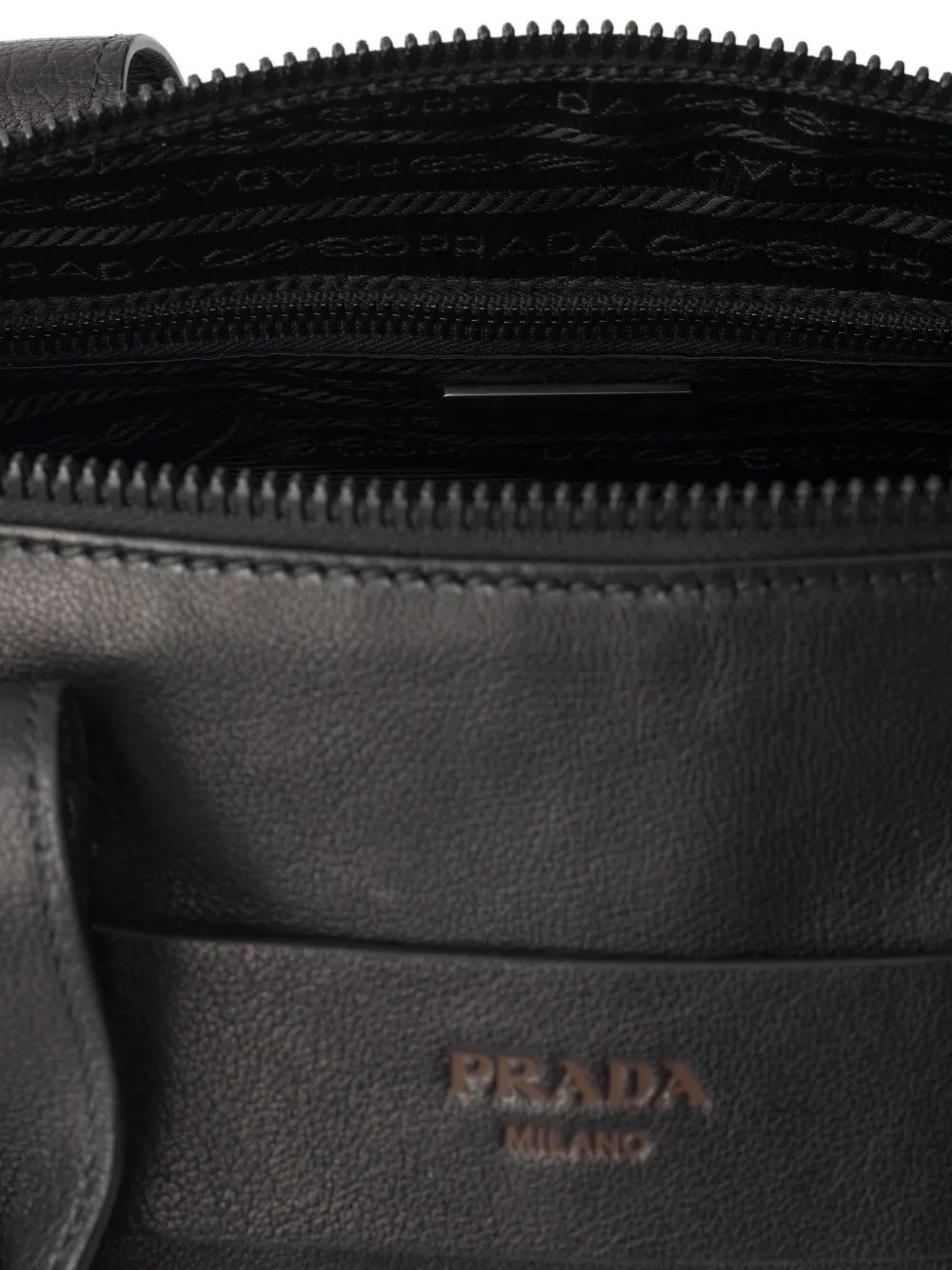 Runway Prada large Route leather tote bag Highlights black double handles metal hardware debossed logo zip closure detachable adjustable leather shoulder strap internal zipper pocket Composition Outer: Buffalo Leather 100% Lining: Nylon 100% Product IDs FARFETCH ID: 33408077 Brand style ID: 1BB162VOOO2HFQ