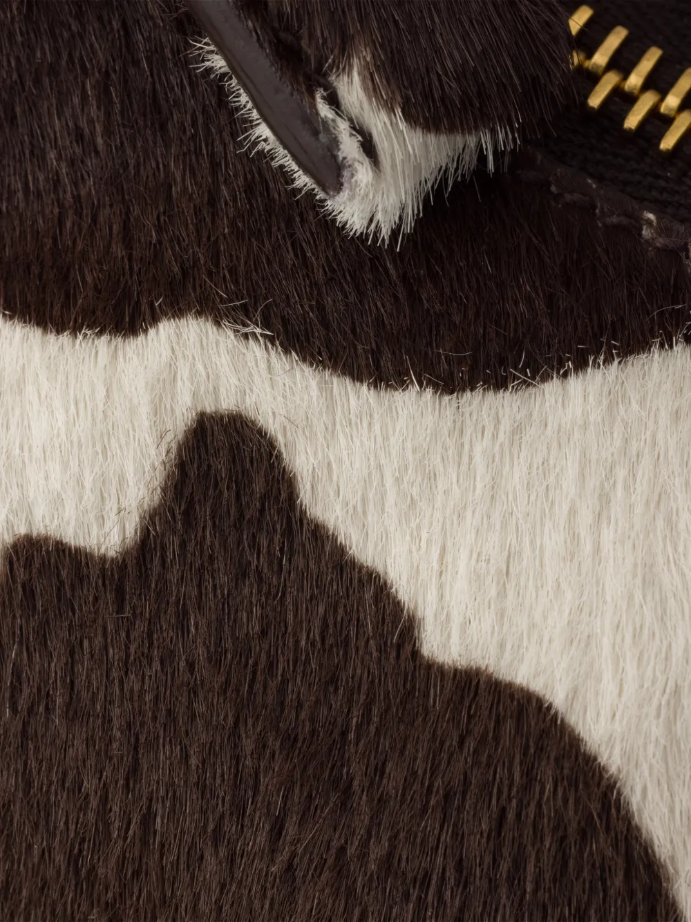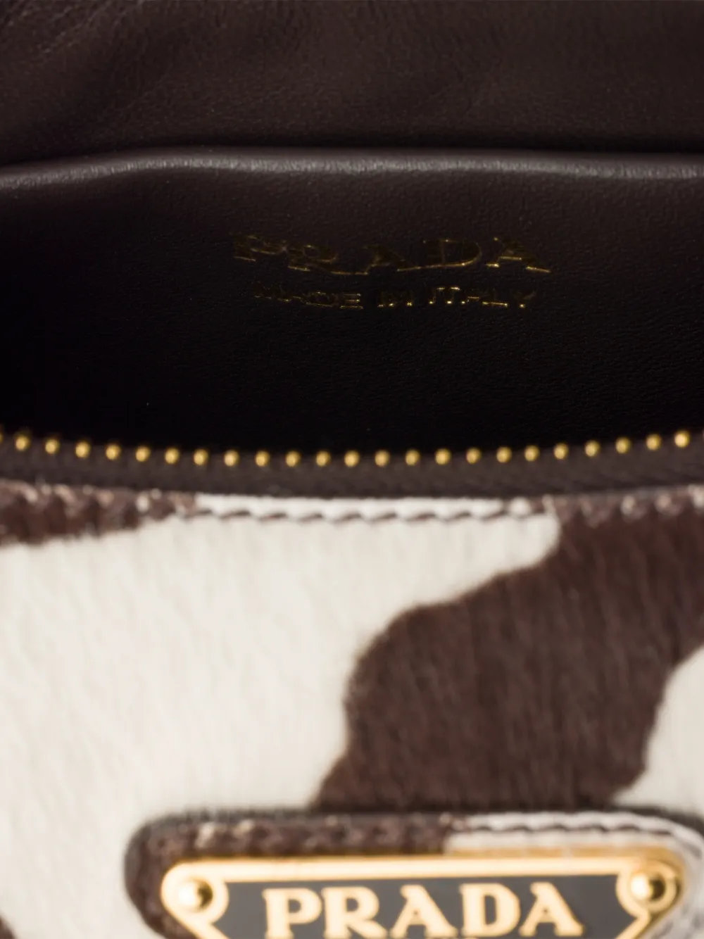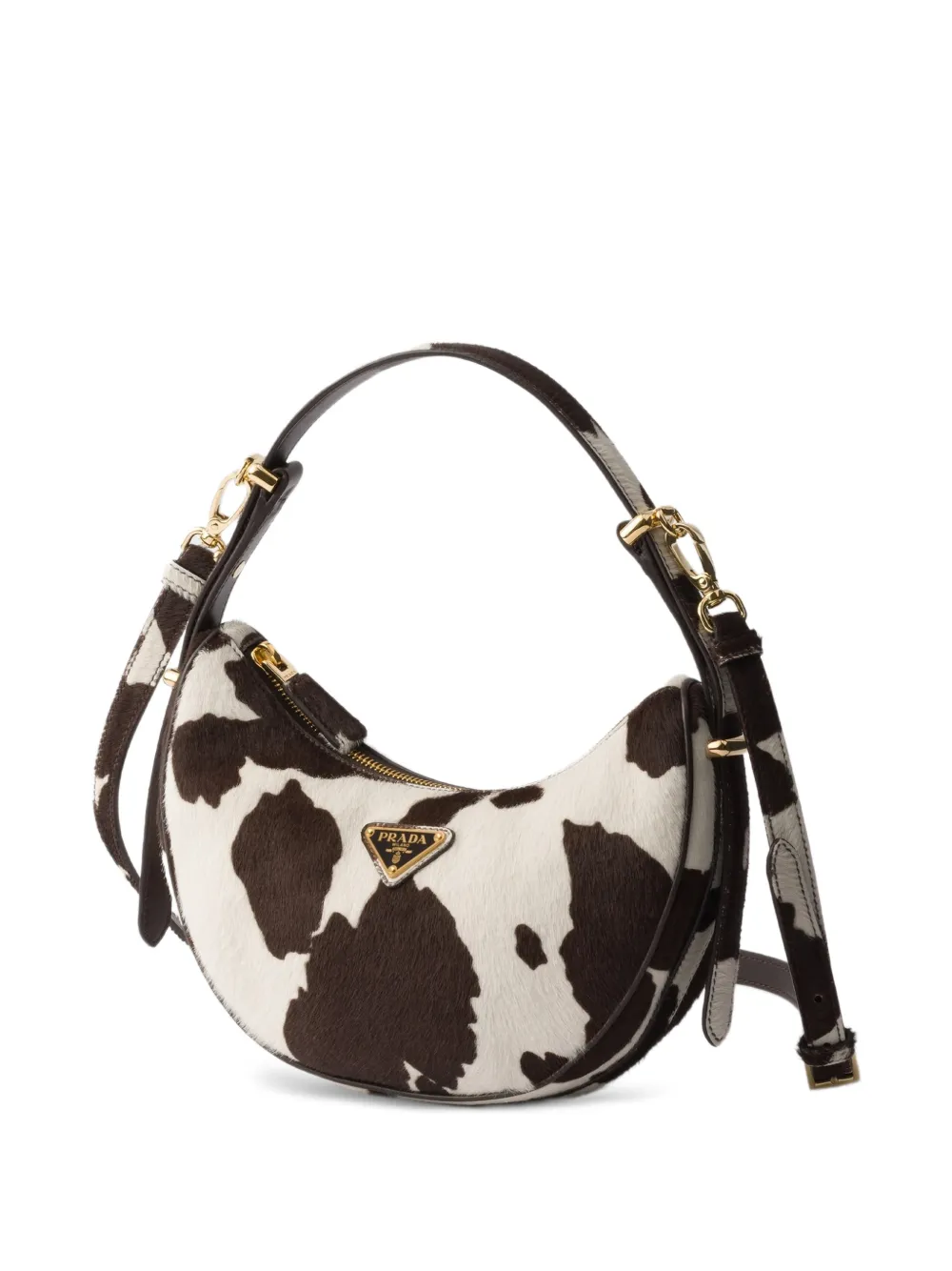 New Season Prada mini Arqué printed leather shoulder bag Highlights white cow print detachable adjustable handle zip closure patch pocket gold-tone hardware Composition Outer: Calf Hair 100% Product IDs FARFETCH ID: 33409047 Brand style ID: 1BC194VOOM2HIM