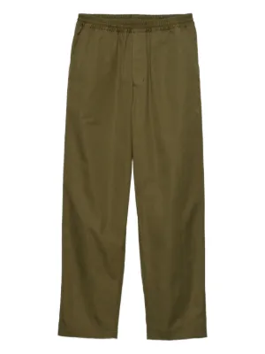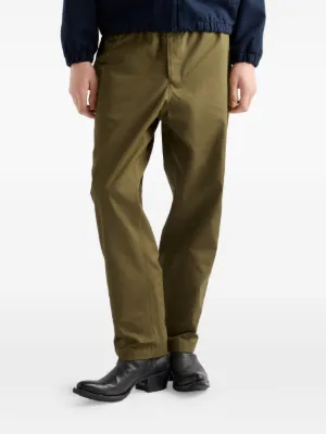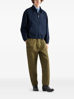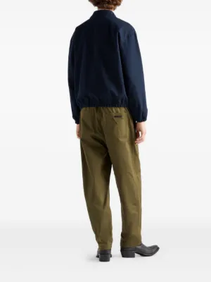 Prada triangle-logo patch-pocket trousers Highlights army green slim fit elasticated waistband drawstring fastening zip fly slash pockets back patch pockets triangle logo patch Composition Cotton 100% Washing instructions Read Manufacturer Guidelines Product IDs FARFETCH ID: 31074596 Brand style ID: SPH497SOOO12VB