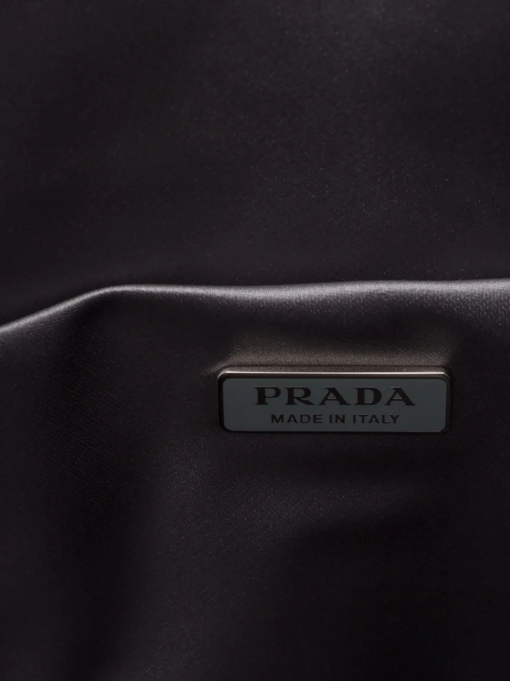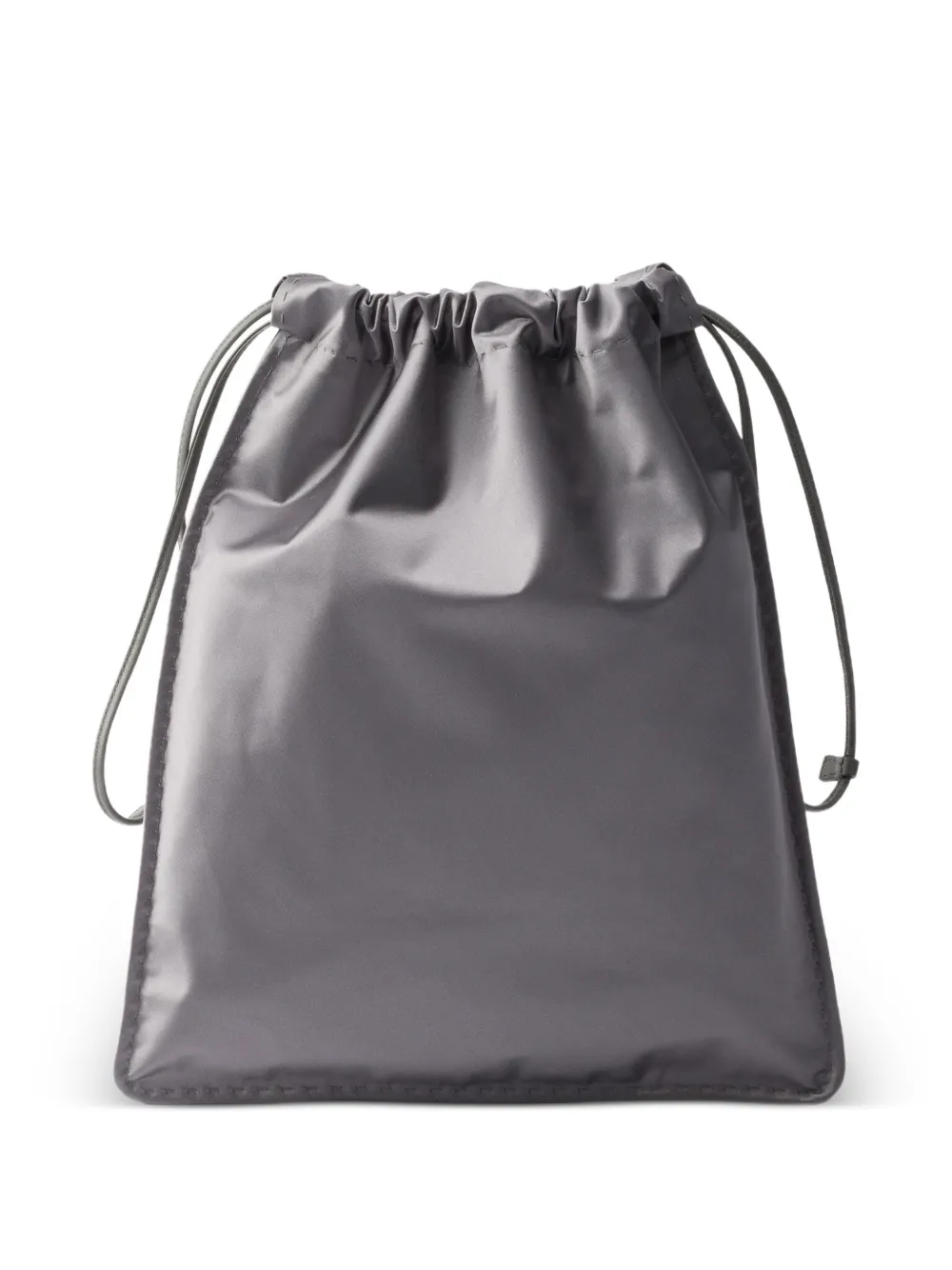 Runway Prada Wish drawstring pouch Highlights grey logo label patch pocket leather drawstring closure leather Handle Loop with Snap Composition Outer: Silk 100% Product IDs FARFETCH ID: 33408084 Brand style ID: 1NK0632G6B