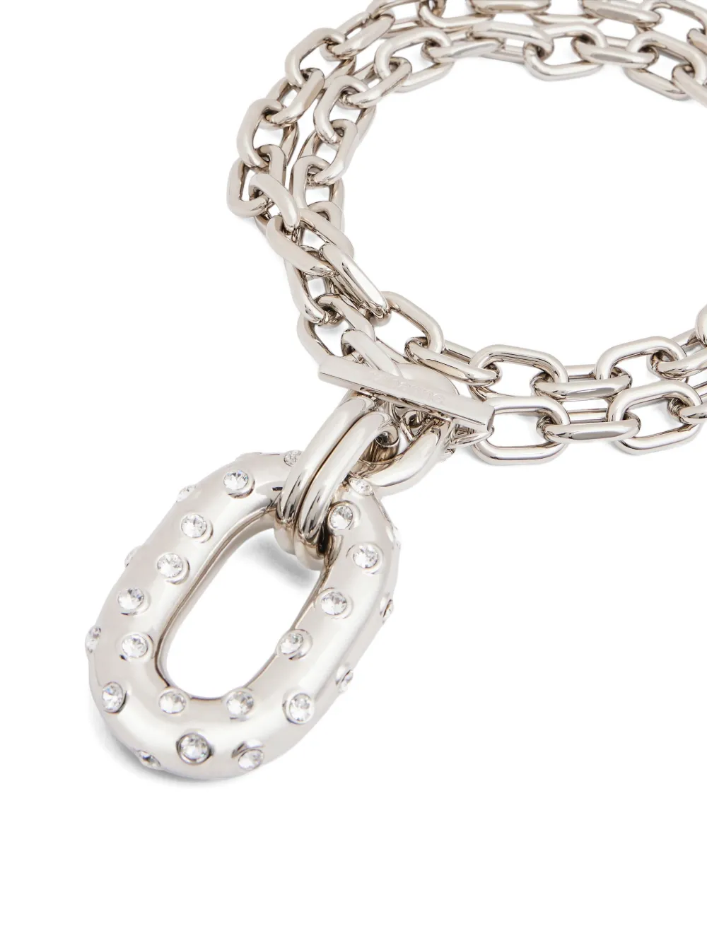 Rabanne Iconic XL chain-link crystal-embellished necklace Made in Italy Highlights silver-tone double chain-link design oval-shaped pendant rhinestones embellishments textured pendant toggle fastening Composition Brass, Rhinestone Product IDs FARFETCH ID: 31361558 Brand style ID: 25HBB0015MET830M064SILVER