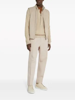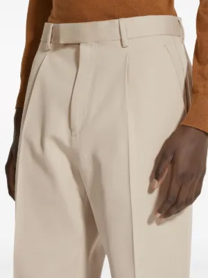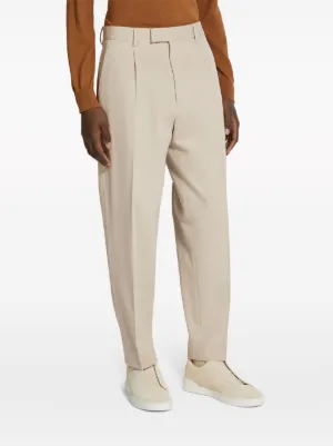 Zegna tapered tailored trousers Imported Highlights light beige cotton-wool blend gabardine weave pleat detailing belt loops concealed front fastening tapered leg two side slit pockets two rear welt pockets straight hem Composition Cotton 57%, Wool 43% Washing instructions Dry Clean Only Product IDs FARFETCH ID: 22497262 Brand style ID: UDI04A7TP45